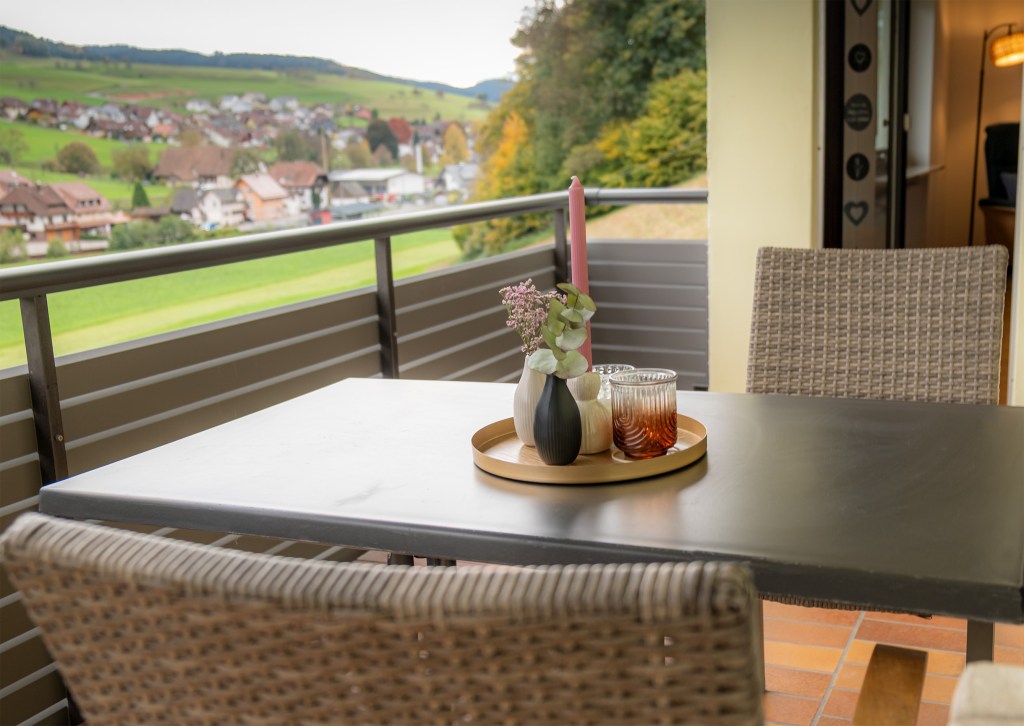 Der überdachte Balkon bietet Raum für Entspannung im Freien. Egal ob spätes Frühstück in der Morgensonne oder ein Glas Wein am Abend – der Blick auf die Schwarzwaldlandschaft macht jeden Moment besonders. Outdoor-Möbel sowie Elektro-Grill sorgen für maximalen Komfort.