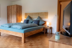 Erleben Sie erholsame Nächte im großen Hauptschlafzimmer der FeWo Huber Oberharmersbach. Das helle Zimmer ist mit einem bequemen Doppelbett, hochwertigen Holzmöbeln und einem modernen Smart-TV ausgestattet – ideal für gemütliche Abende nach einem aktiven Tag im Schwarzwald. Durch die ruhige Lage und den natürlichen Lichteinfall entsteht eine wohltuende Atmosphäre zum Abschalten und Träumen.